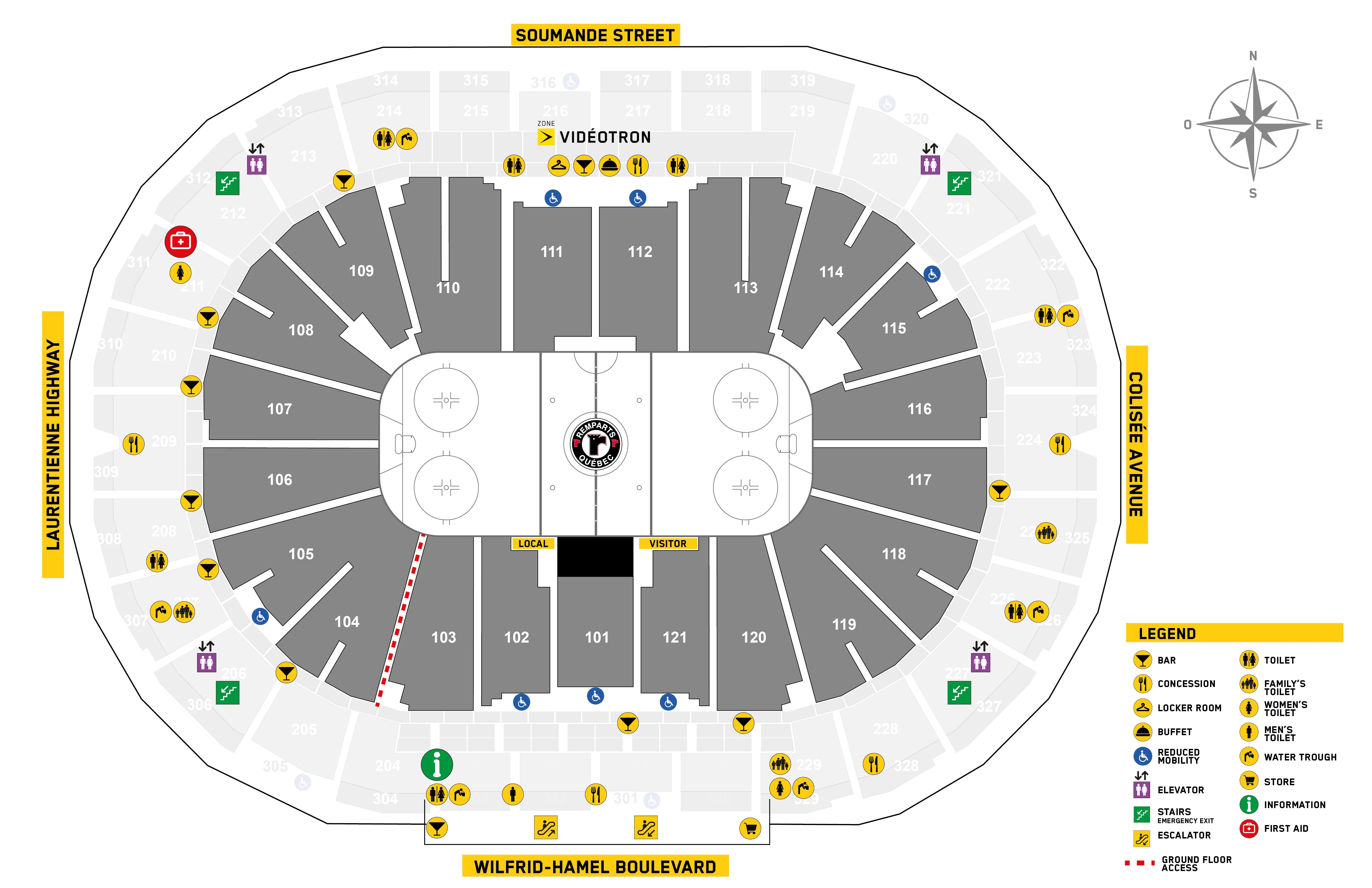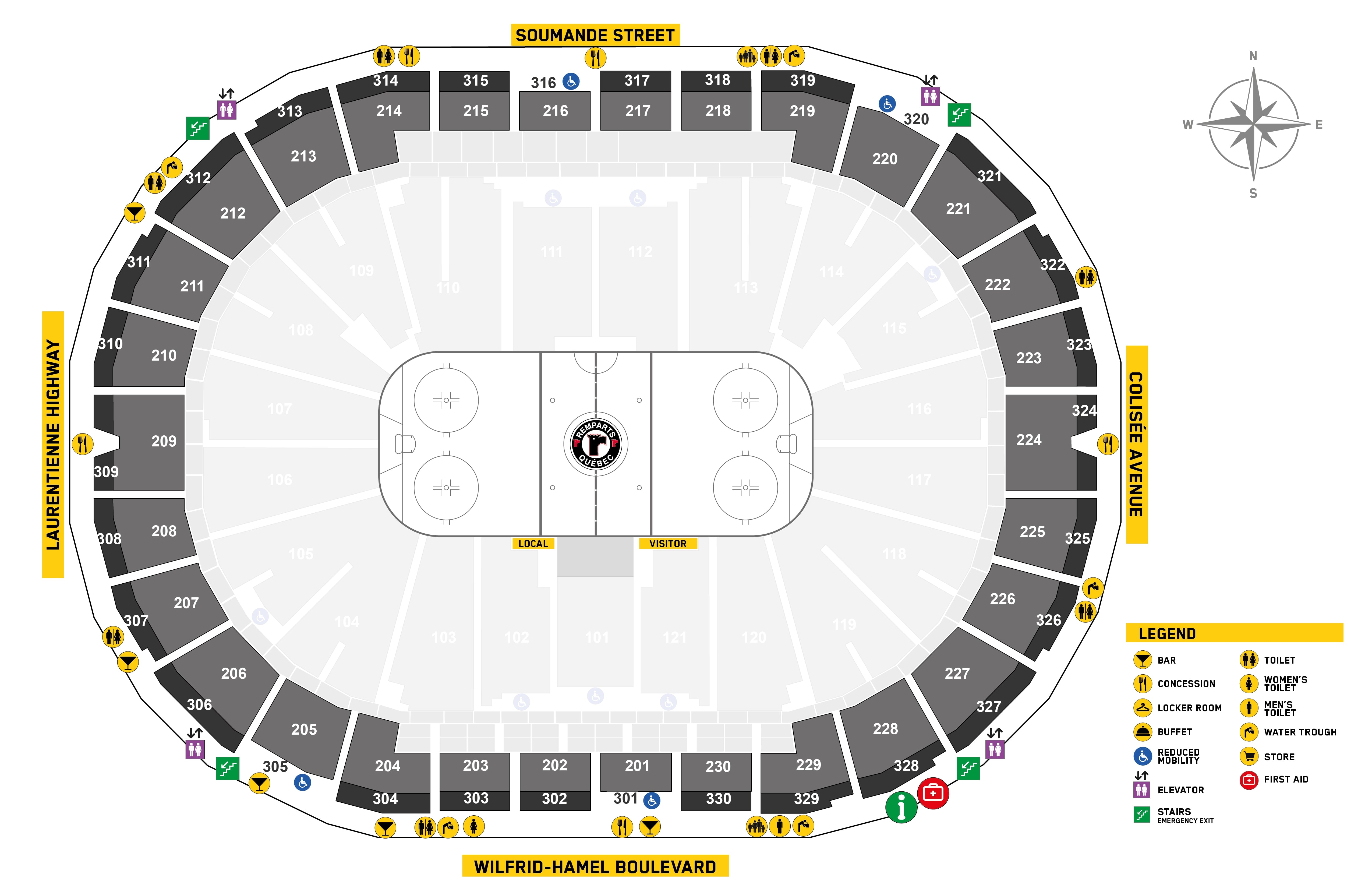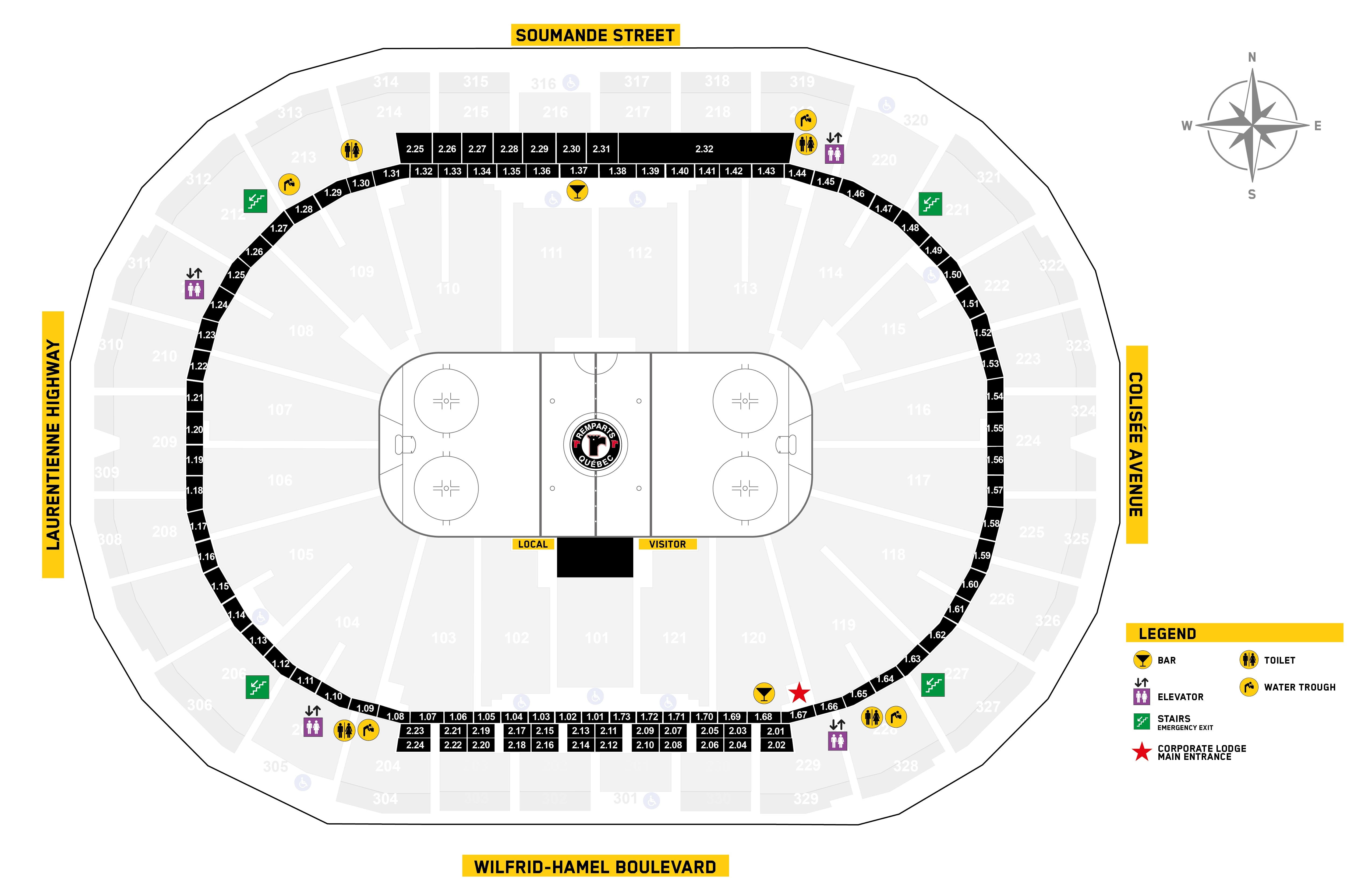 To visualize the space and easily locate all amenities in the arena, please consult the seating charts below.