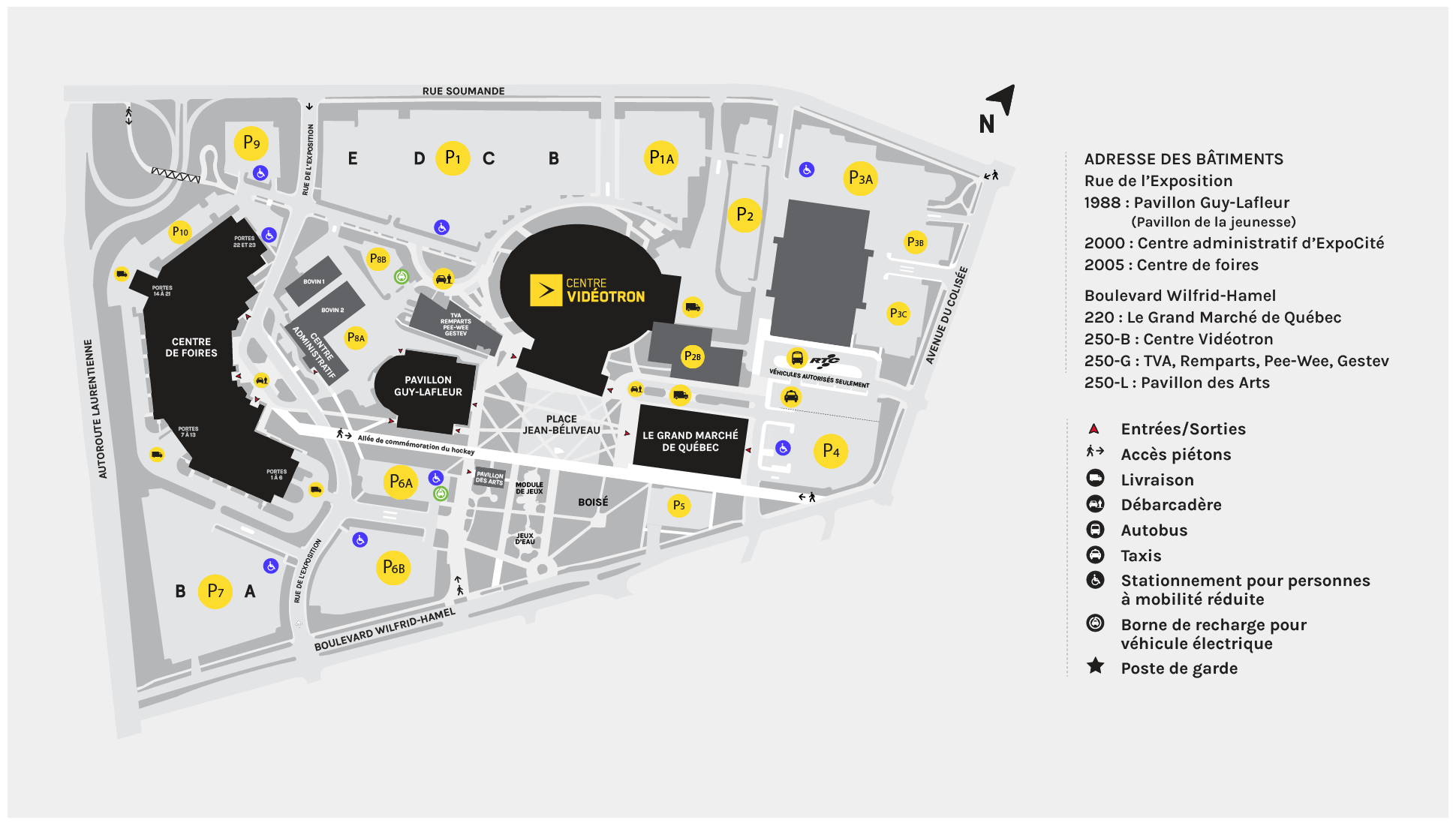L’accès au stationnement se fait via la rue Soumande. Vous pouvez également rejoindre le site d’ExpoCité et le Centre Vidéotron via l’est, en passant par l’entrée située sur l’avenue du Colisée.